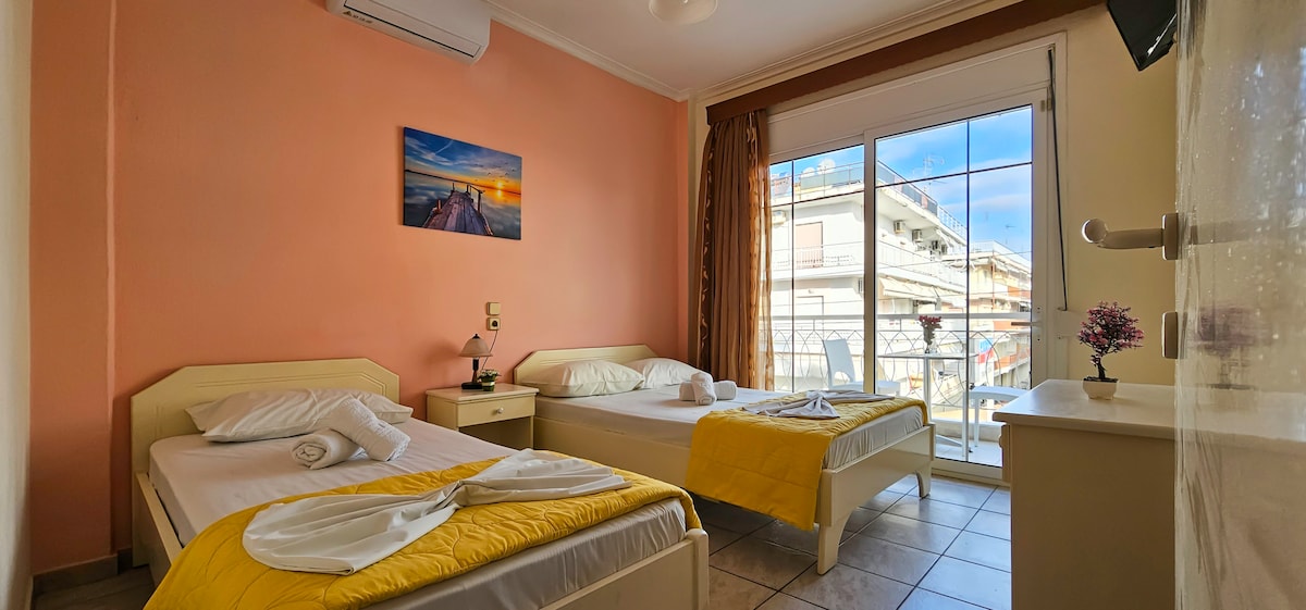 The Accessible Double Room offers a welcoming and inclusive stay, specifically designed for guests with accessibility needs, while delivering a high level of comfort and convenience. It boasts stunning street views, allowing you to soak in the beauty of the first street of Paralia right from your room.