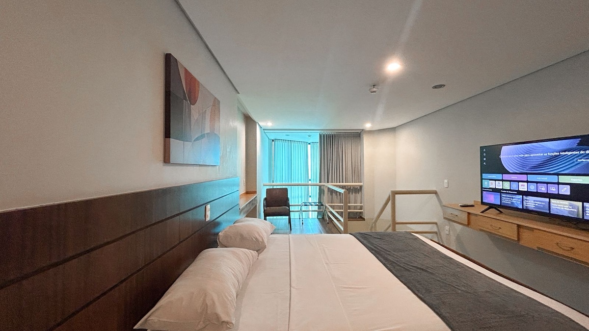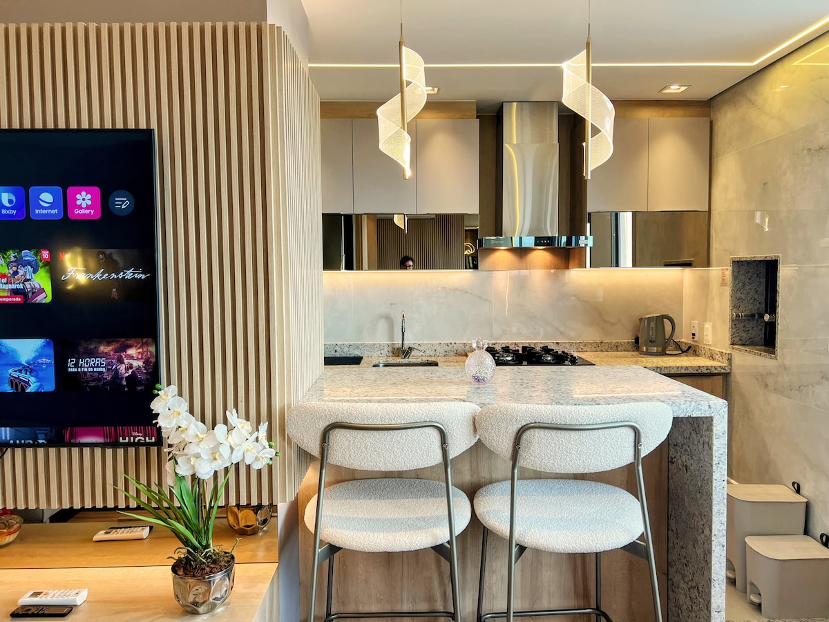 Com decoração inspirada em Bali, esse studio sofisicado possui uma atmosfera que evoca a tranquilidade das praias e florestas de Bali. Aqui você poderá descansar nos melhores enxovais da Mmartan. Possui cozinha completa, com fogão, forno elétrico, microondas, sanduicheira, liquidificador, cafeteira nespresso e chaleira elétrica. E para continuar a sensação relaxante, você poderá usufruir da vista mais linda da cidade com piscina de borda infinita no 20º andar. Apaixone-se por essa hospedagem!