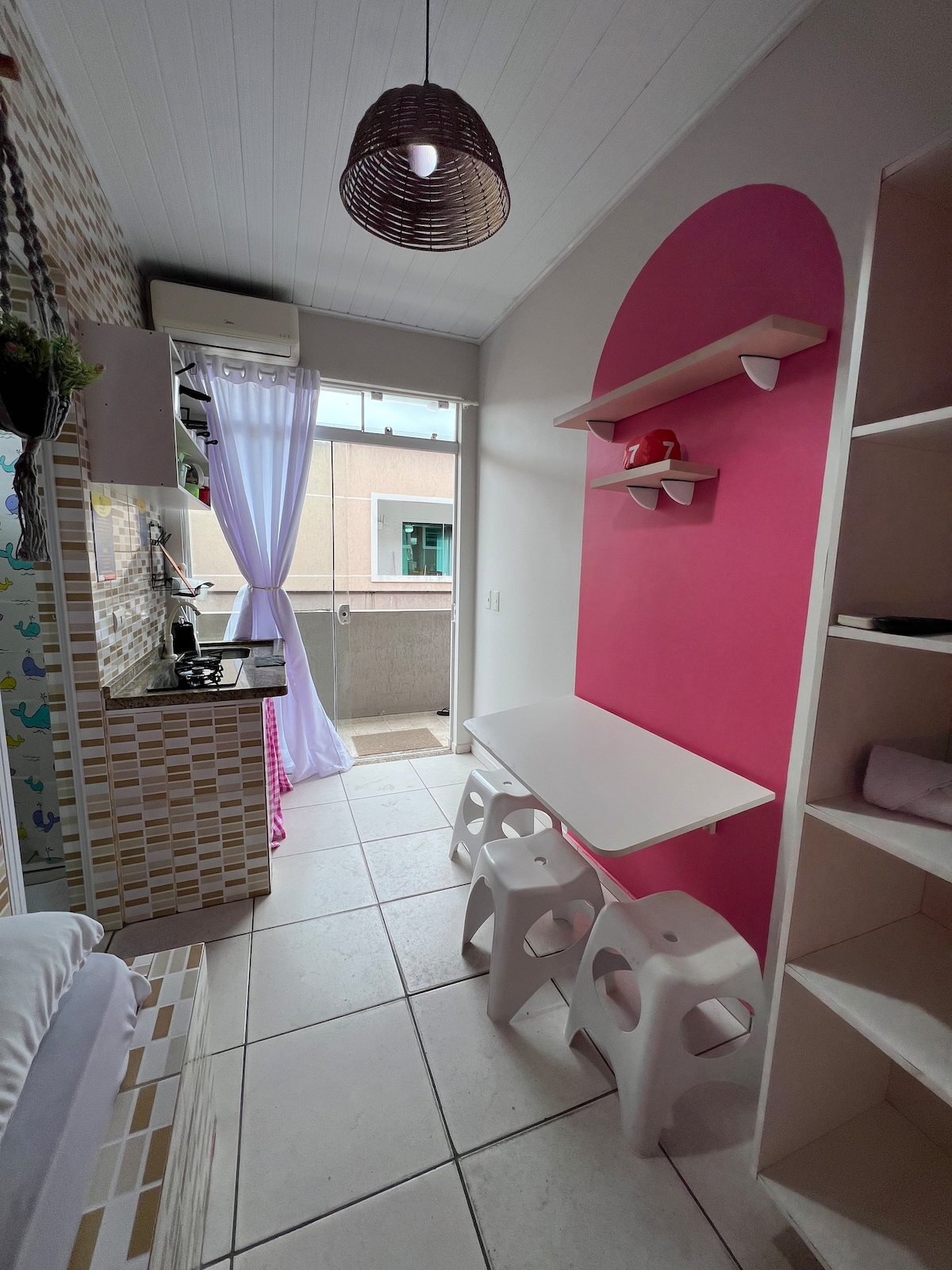 Este lindo STÚDIO ideal para duas Pessoas (2) e atende até quatro (4) pessoas, possui: * Sacada c/Churrasqueira; * Armário de Roupa; * Cama de Casal + Colchonete; * Dois Puffs + Colchonete; * Máquina de lavar; * Rack com Painel e TV Smart; * Wi-fi incluso; * Fogão; * Forno Micro-ondas; * Ar-Condicionado; * Secador de Cabelo; * Ferro de passar Roupa; * Liquidificador; * Assadeira; * Chaleira Elétrica *Mesa fechada para 2 pessoas e aberta para 4 pessoas.