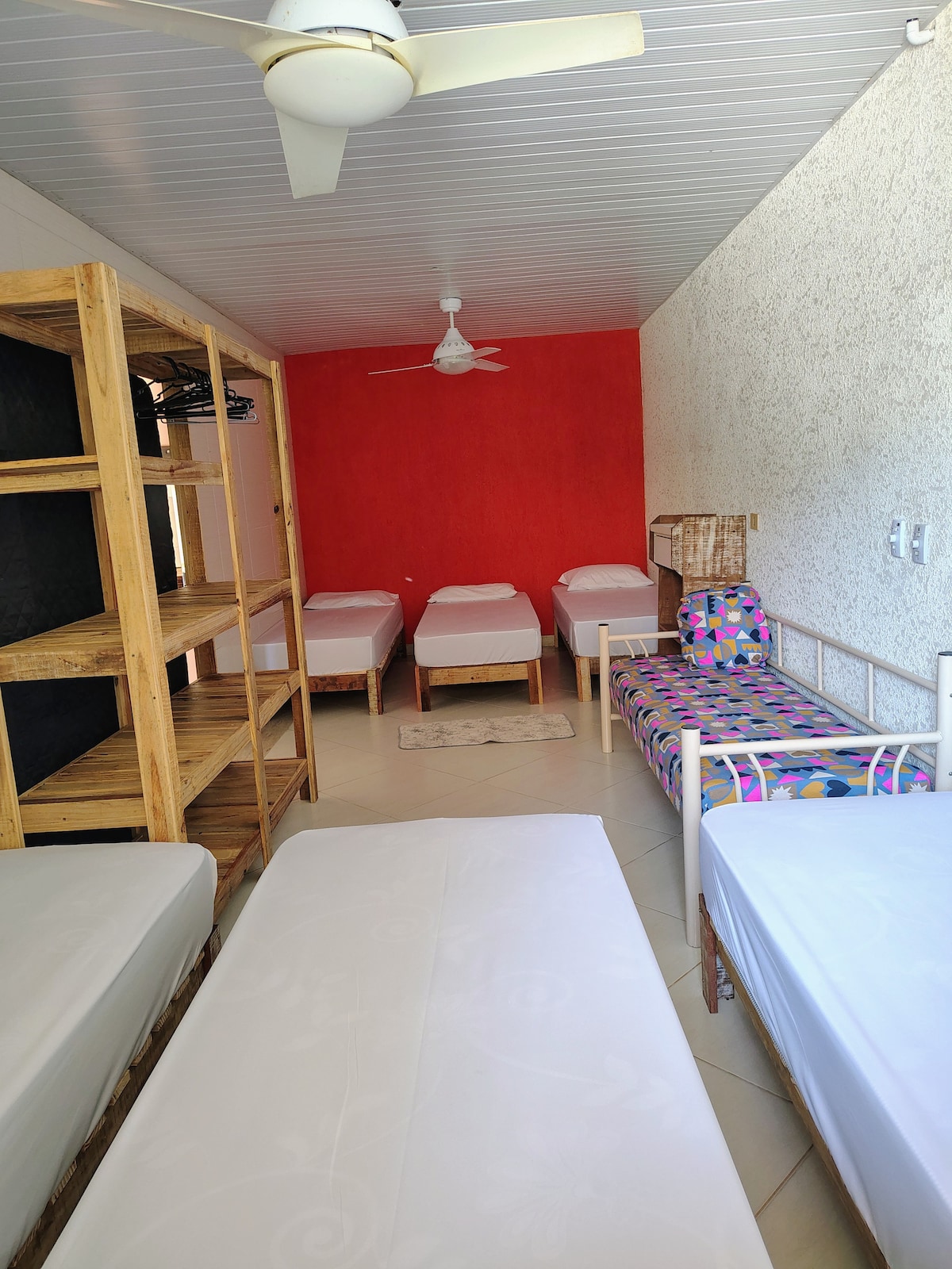 Este é o nosso quarto coletivo, o Vale dos Duendes. Possui 3 beliches, banheiro privativo e 2 ventiladores portáteis. Roupa de cama e travesseiro estão incluídos. Caso necessite de coberta e toalhas, temos esses itens para locação. Nossa cozinha coletiva fica à disposição, respeitando a política da casa. Venha descansar e aproveite para fazer novas amizades!!!