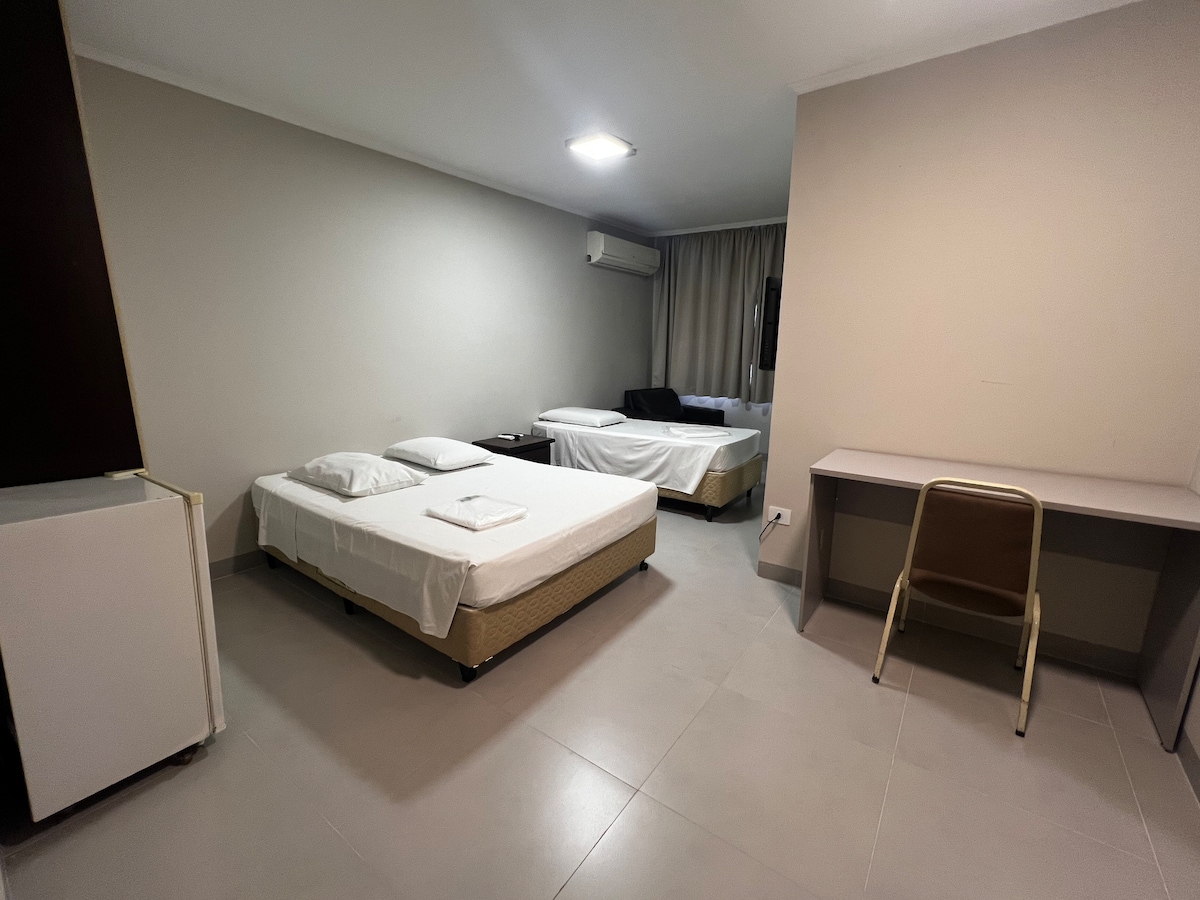 Quarto contendo uma cama de casal king, frigo bar, TV a cabo sky, ar condicionado e microondas.