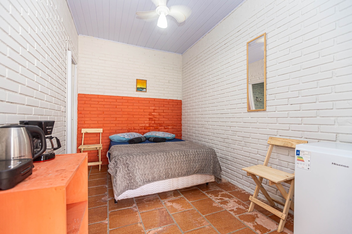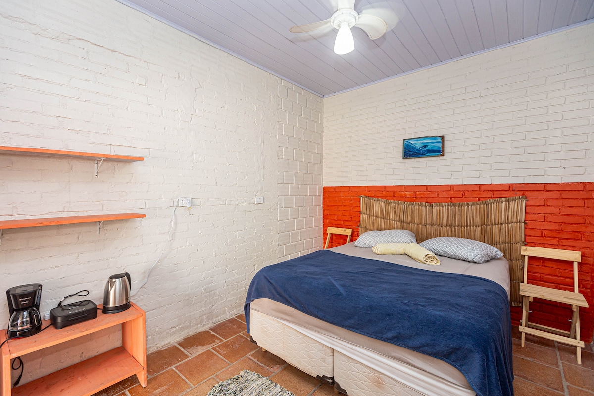 Suite exclusiva a apenas duas quadras da praia! 🌅🏖️ Cama box casal, roupas de cama e banho, armários para roupas, ventilador de teto, frigobar, cafeteira, sanduicheira, chaleira elétrica e chuveiro elétrico 220v. Check-in e Check-out flexíveis!