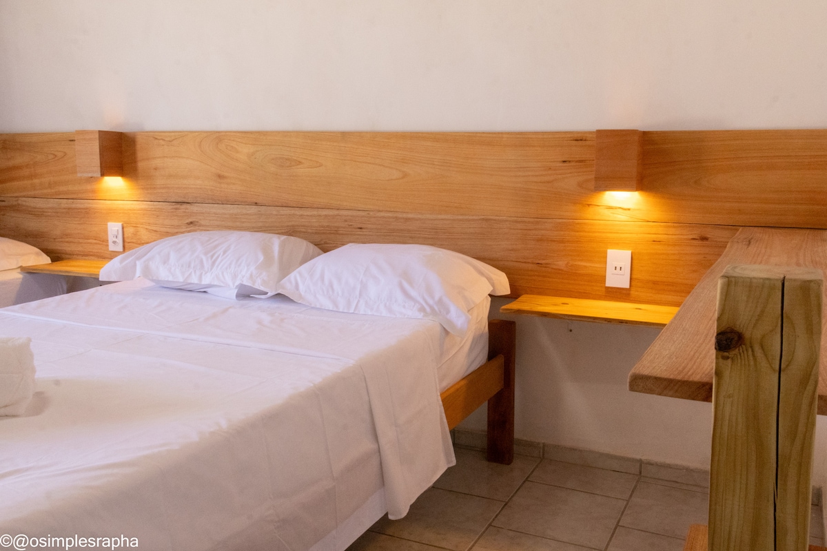 Relaxe neste lugar único e tranquilo a apenas 160 metros da praia. ☀️🏖️🌊 Suite com cama casal, roupa de cama, ventilador no teto, banheiro exclusivo, frigobar, cafeteira, sanduicheira, chaleira elétrica, espaço para refeições e rede.