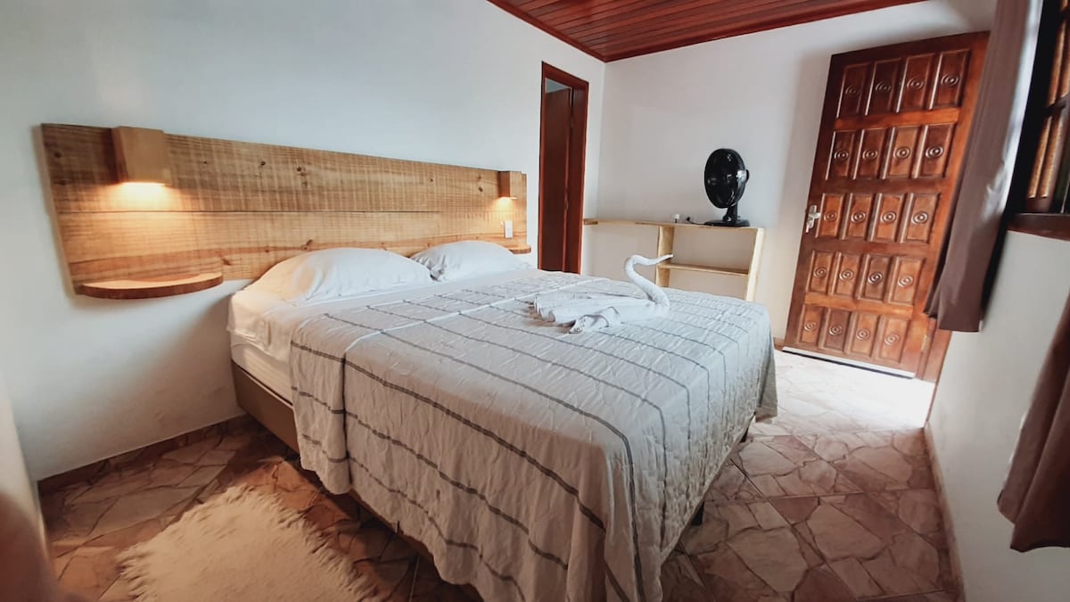 Relaxe neste lugar único e tranquilo a apenas 160 metros da praia. ☀️🏖️🌊 Suite com cama casal, roupa de cama, ventilador no teto, banheiro exclusivo, frigobar, cafeteira, sanduicheira, chaleira elétrica, espaço para refeições e rede. Check-in e check-out flexíveis!