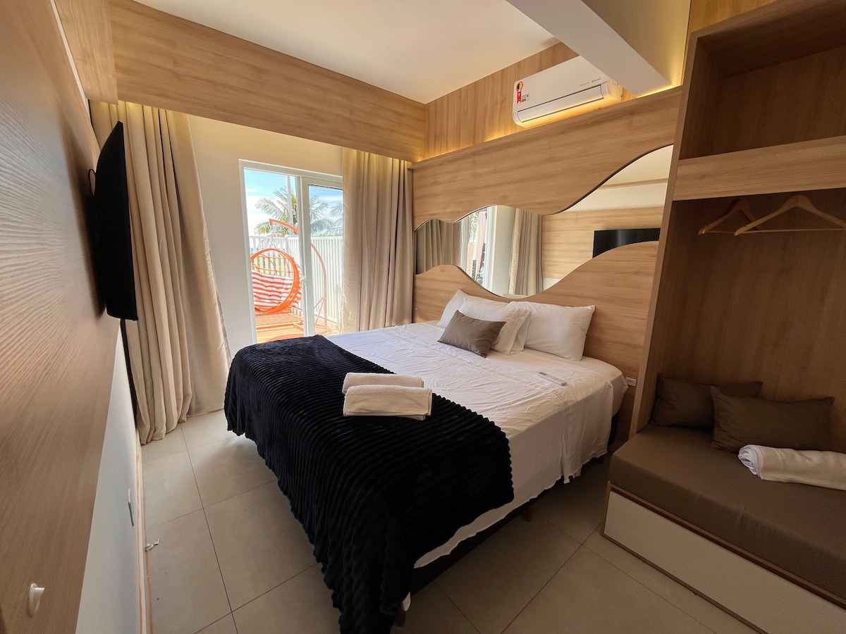 Come and enjoy comfortable and friendly accommodation on the seafront in Matinhos. Located on the seafront avenue, practically with your feet on the sand. This beautiful Studio offers: • Air conditioning; • Smart TV; • Minibar; • Microwave; • Electric cooktop; • Oven; • Electric Kettle; • Electric sandwich maker; • Blender; • Hairdryer; • Iron; • Guitar; • Kitchen utensils. We do not provide bath towels or bed linen, guests must bring them.