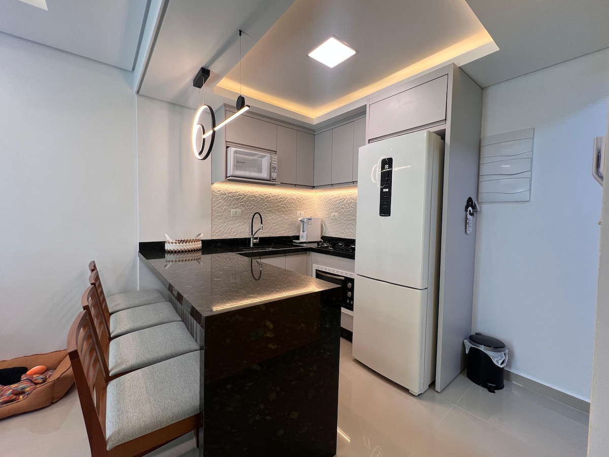 Apartamento Beira-Mar Relaxe neste novo apartamento, totalmente mobiliado com móveis planejados. Com ar condicionado em todos os ambientes, Smart TV na sala e no quarto, Wi-Fi e uma sacada com churrasqueira. Você terá uma vista incrível do mar e das montanhas. A cozinha é equipada com utensílios elétricos para seu conforto, forno, micro-ondas, fogão, geladeira, máquina lava e seca. Oferecemos empréstimo de 4 cadeiras de praia, 1 guarda-sol e caixa térmica para aproveitar o dia à beira-mar.