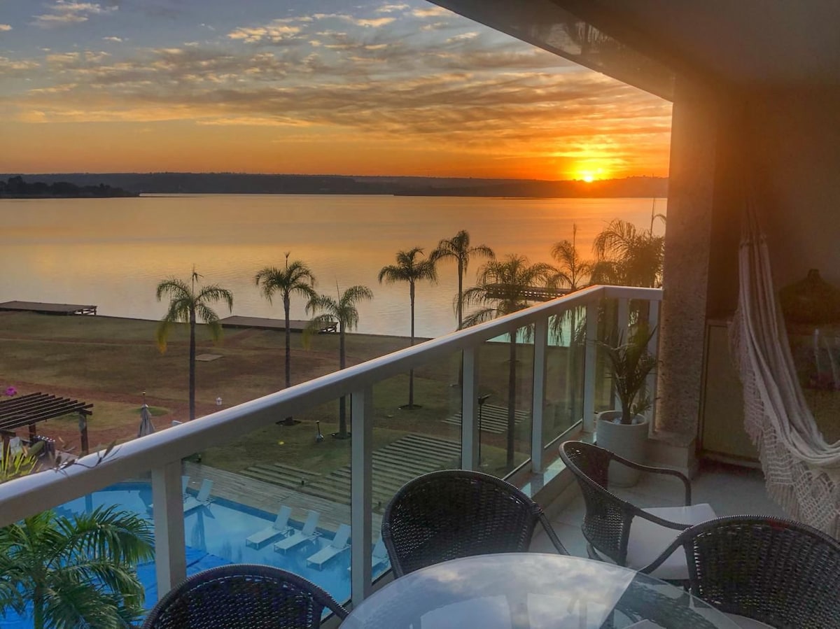 Flat à beira do Lago Paranoá no Lake View Resort, próximo à Esplanada dos Ministérios. Espaço comum com estacionamento, área de lazer com piscinas, sauna, SPA com jacuzzi e área de massagem, academia, pier, espaço gourmet, loja de conveniência, espaço de trabalho e acesso a internet. O check-in será feito na recepção do Resort, que funciona 24h.