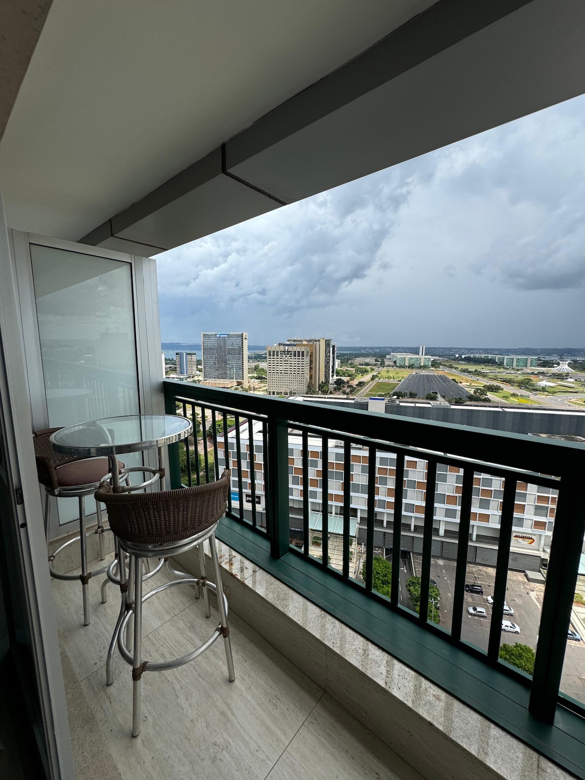 Nice view. Double bed, TV42', air cond, microwave and refrigerator. Dining table, countertop and large cabinet with mirror. Restaurant with beautiful terrace view and offers meals that can be requested (paid separately). Nearby shopping malls Conjunto Nacional and Brasilia Shop, and restaurants and convenience. Gym, sauna and swimming pool(2). Several BSA attractions are super close by. Children are not allowed in the apartment for security. Cleaning 1 time every 7 days w/full trousseau change.