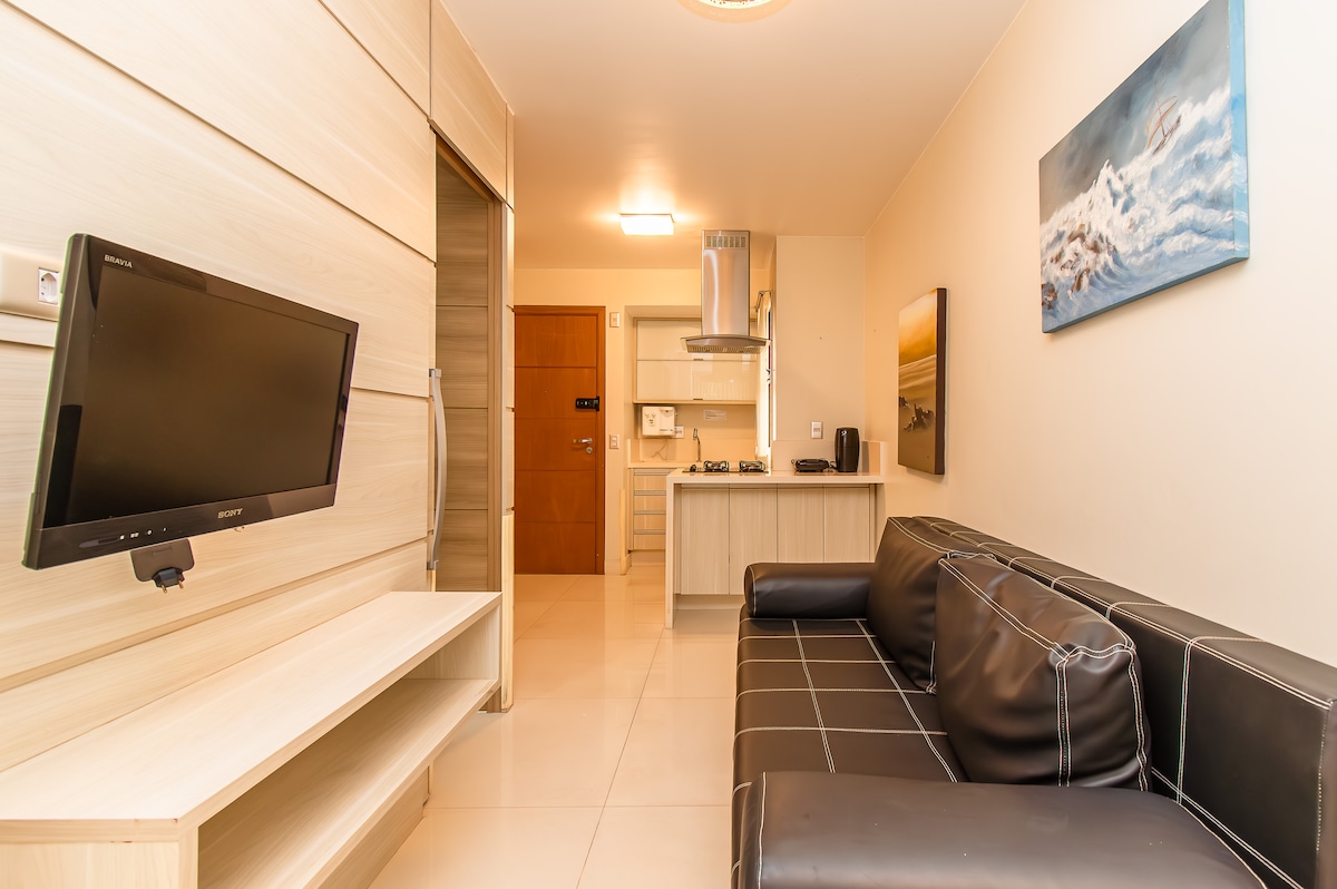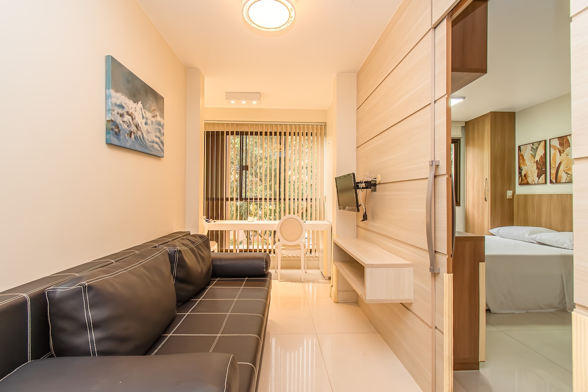 Comfort in the heart of Brasília. Stay in the strategic Block L of Life Resort, with a view of the garden and a small stream. Just steps from a mini market, café, pub, pizzeria, salon, gym, heated pool. Ideal for 2 people, but can accommodate up to 4 with a sofa and extra mattress — perfect for short stays with great value. Equipped kitchen, air conditioning, Smart TV, Wi-Fi, clean towels, and amenities. Only 5 minutes from the Esplanade. Lakeside area with kayaking and other water sports.
