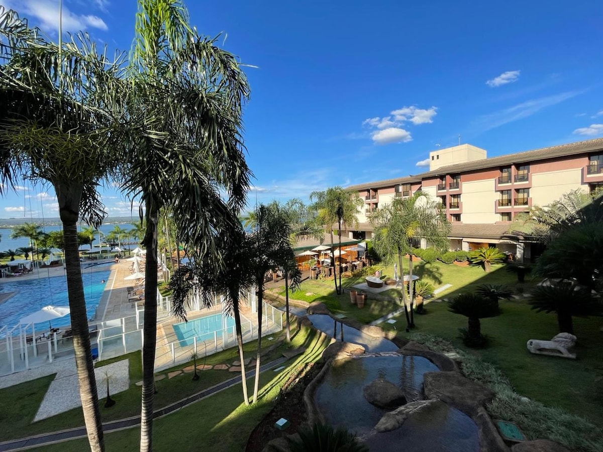 Comfort in the heart of Brasília. Stay in the strategic Block L of Life Resort, with a view of the garden and a small stream. Just steps from a mini market, café, pub, pizzeria, salon, gym, heated pool. Ideal for 2 people, but can accommodate up to 4 with a sofa and extra mattress — perfect for short stays with great value. Equipped kitchen, air conditioning, Smart TV, Wi-Fi, clean towels, and amenities. Only 5 minutes from the Esplanade. Lakeside area with kayaking and other water sports.