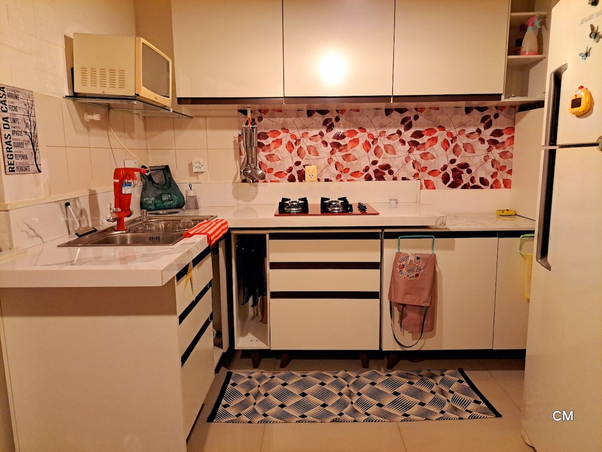 Novo apartamento aconchegante e silencioso, ar condicionado novíssimo (18.000 BTUS), internet Wi-Fi particular (500 MB), smart TV de 32'' com Netflix, cozinha com todos os utensílios novos, filtro de água potável, micro-ondas, frigobar, fogão elétrico, liquidificador, sanduicheira, nespresso, secador de cabelo, ferro de passar, espaço para home office, ótima luminosidade e banheiro com bancada e chuveiro novos! Condomínio seguro e tranquilo com porteiro, câmeras de segurança e vaga na garagem.