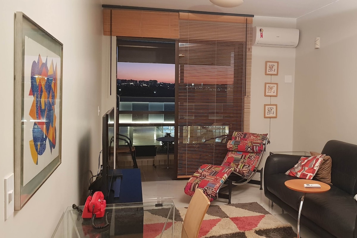 Ótimo lugar para aliar diversão a comodidade de estar a 5 min do centro de Brasília! Apartamento de 24m² bem confortável com uma cama de casal queen com duas auxiliares. O resort além da beleza, oferece várias opções de lazer como piscinas aquecidas, acesso ao lago, restaureantes, etc. Aos fins de semana programação bem social com acesso ao lago. A limpeza das piscina e na segunda-feira