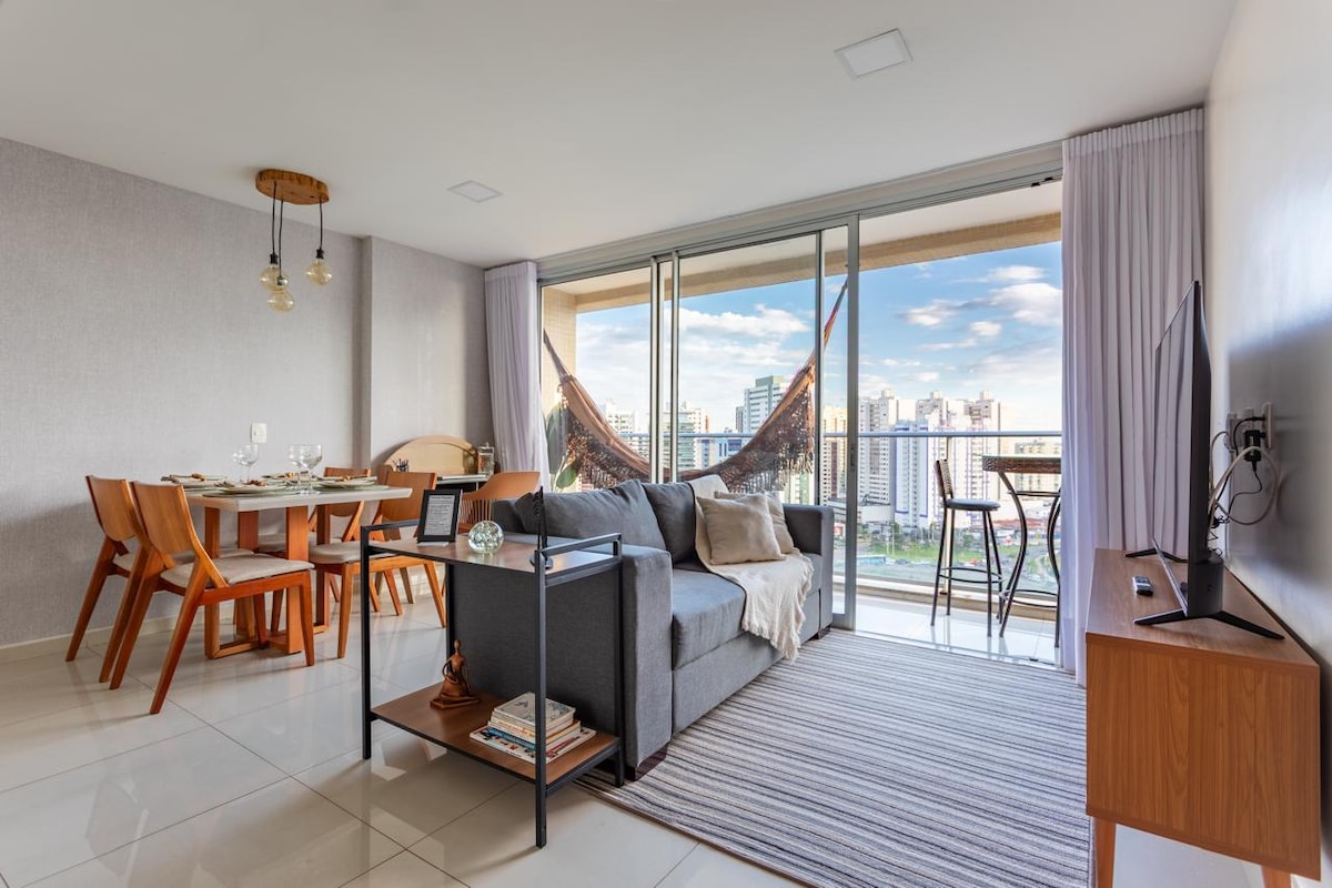 O apartamento é ideal para casais, estudantes, solteiros e quaisquer pessoas que estejam à procura de muita elegância e conforto aliadas à praticidade que a mobília de fino acabamento e os utensílios de alta qualidade do apartamento proporcionam. Ele se destaca pela localização privilegiada, com acesso ao Plaza Shopping DF e ao supermercado Carrefour e Sam’s Club dentro do complexo que inclui o condomínio. É isso mesmo! Basta descer até o Térreo, sair na portaria e você se encontra dentro do Plaza Shopping. Dentro dele, está o Carrefour e o Sam’s Club. - Netflix - Cafeteira - Lavanderia - Airfryer Equipado com fogão de indução de quatro bocas, geladeira duplex 360 litros, coifa, mesa com duas cadeiras ajustáveis, utensílios de cozinha - como pratos, talheres, copos, taças, xícaras, jarras, jogo de panelas de indução de alta qualidade, conchas, tábuas, entre outros -, roupas de cama e de toalhas de primeira linha, micro-ondas 30 litros, CAFETEIRA, sanduicheira, guarda-roupas, airfryer, produtos de higiene e de limpeza. O apartamento possui uma cama de casal com travesseiros, lençóis e cobertores de melhor qualidade para proporcionar o máximo de conforto para todos os hóspedes. Além disso, temos um sofá retrátil na sala, com 1,90m já acabado, com acolchoamento de primeira linha.