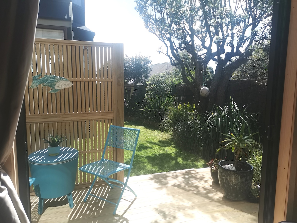 Seven minutes walk from Otaki Beach. Relax and unwind on your own private deck off our newly built sunny garden guest suite. Our self-contained suite is situated away from the main house and is ideal for a couple, solo adventurers, and business travelers. We provide a comfy bed and optional cooked breakfast. As well as full cooking facilities. Time it right and you can help yourself to seasonal produce from the garden and free range eggs from our lovely chooks.