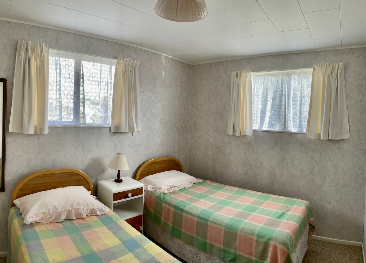 Comfy Kiwi bach one block back from the beautiful & quiet Te Horo beach. Sunny, spacious, fully fenced garden, great for kids or pets, alfresco dinning or relaxing in the sun. Fully equipped kitchen. Heatpump to keep the whole bach cool....or warm if needs be! Recently stocked with new linen, towels, beach towels, pots, pans & kettle . Two separate bedrooms, one with a comfy queen bed & the other with two singles. Shower over bath and laundry facilities.
