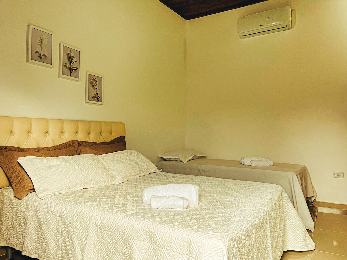 Quarto com banheiro privativo, TV, frigobar, ventilador de teto e ar condicionado com taxa adicional.