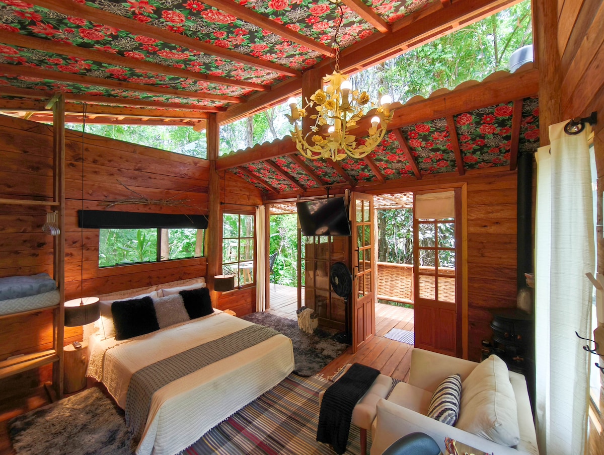 Lindo chalé em Paraty, em plena mata atlântica. Excelente para quem busca uma experiência única e uma verdadeira imersão na natureza. Deck com uma vista incrível, contato com animais silvestres, sossego total, local tranquilo, próximo a cachoeiras e a cerca de 25 min de carro do centro historico e das principais praias da região. Pequena piscina com água da nascente, ducha externa, churrasqueira fogo de chão, rede no deck, wifi e sinal 4G. São 9km do centro, sendo 3km de terra