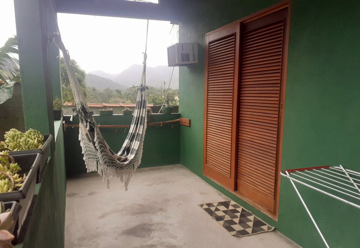 Chalet located on a quiet street, in Bairro Caborê, in a gated and secure condominium. Close to the beach and 1.5km from the Historic Center of Paraty and the neighborhood market. House equipped with all household items for a comfortable stay. Mezzanine bedroom with double bed and bathroom, single bed in the living room, and bathroom downstairs. Balcony with hammock in front of the house, and small yard in the back.