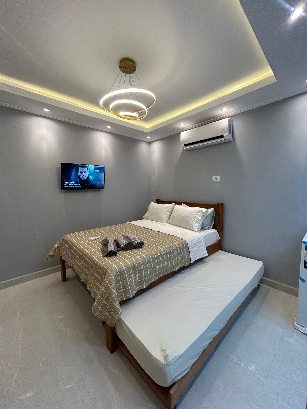 Com uma pedra natural na parede, possui cozinha integrada com sala de loft com decoração contemporânea. Quarto para casal e crianças com traços de hotel, de clima rustico e sofisticado. Todos os ambientes são integrados: hall, quarto, cozinha, sala de jantar, área de TV. OBS: A piscina é compartilhada.