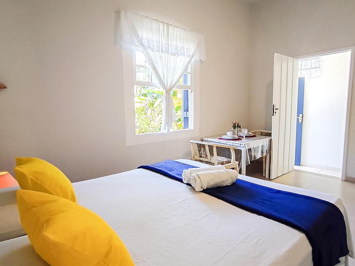 Suíte térrea, para casais que querem aproveitar a cidade com conforto e tranquilidade. Localizada à aproximadamente 3km do Centro Histórico e das principais cachoeiras. Excelente para estadias de turismo, permitindo explorar Paraty durante o dia e descansar em um ambiente silencioso e aconchegante à noite. O espaço também atende muito bem quem precisa conciliar viagem e trabalho, sendo adequado para home office e estadias mais longas, sem perder o clima de férias.