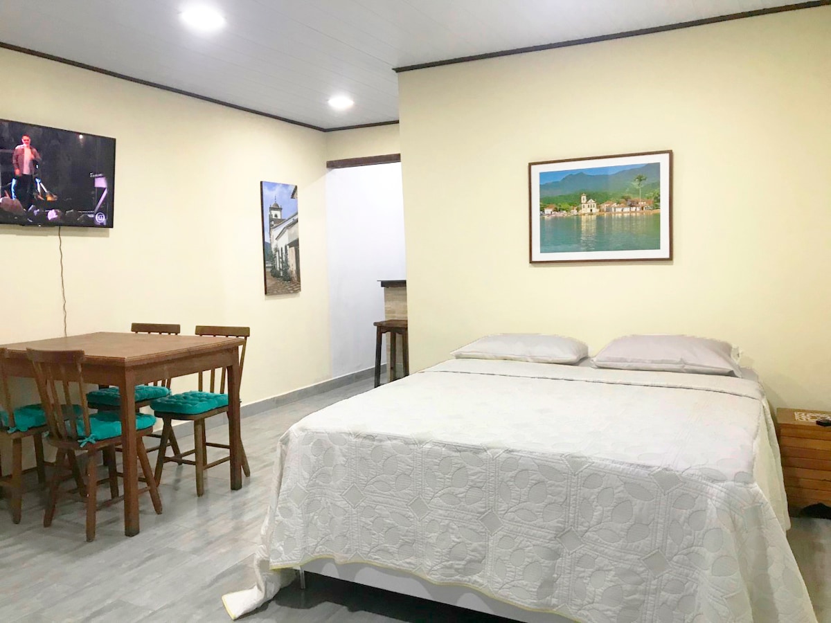 LOFT bem localizado e funcional, a apenas 6,3 km (cerca de 10 minutos) do Centro Histórico de Paraty. O espaço acomoda até 5 pessoas com conforto, oferecendo quarto equipado, roupas de cama, banho e cozinha completa, lavanderia c/ máquina de lavar, área externa e estacionamento. Ambiente silencioso, em meio à natureza, com fácil acesso às praias e atrações da cidade. Excelente custo-benefício para quem busca praticidade e conforto. Um lugar para sentir saudades e chamar de seu LAR em PARATY.