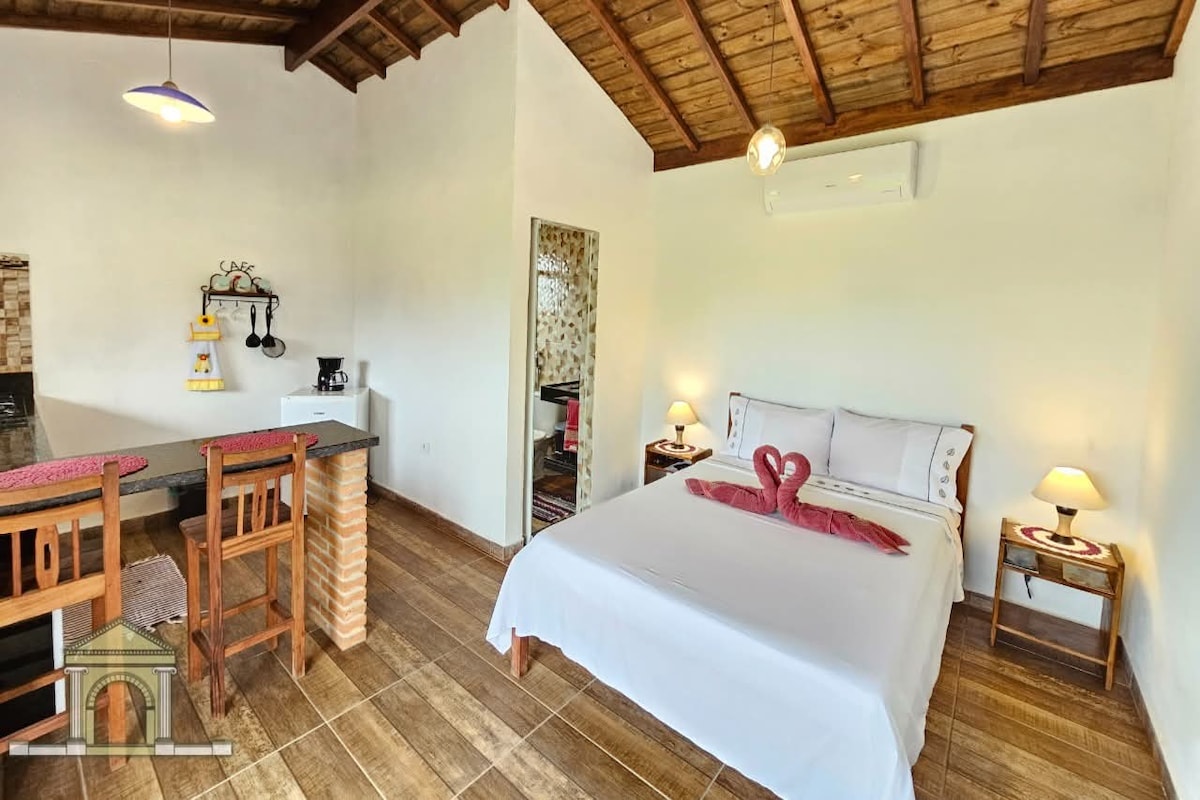 🌿 Chalé ecológico e privativo na Mata Atlântica com acesso exclusivo ao rio e possibilidade de fazer observação de aves. A 15 min do Centro Histórico de Paraty, com fácil acesso de carro e ônibus que para na porta. Equipado com cama king size, lareira ecológica, chuveiro com aquecimento solar, varanda e cozinha equipada. Café da manhã caseiro opcional, consulte disponibilidade e valores. O Refúgio perfeito para quem busca paz, natureza e conforto consciente.