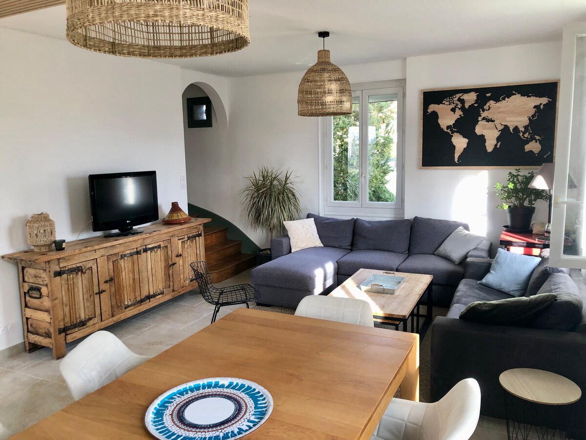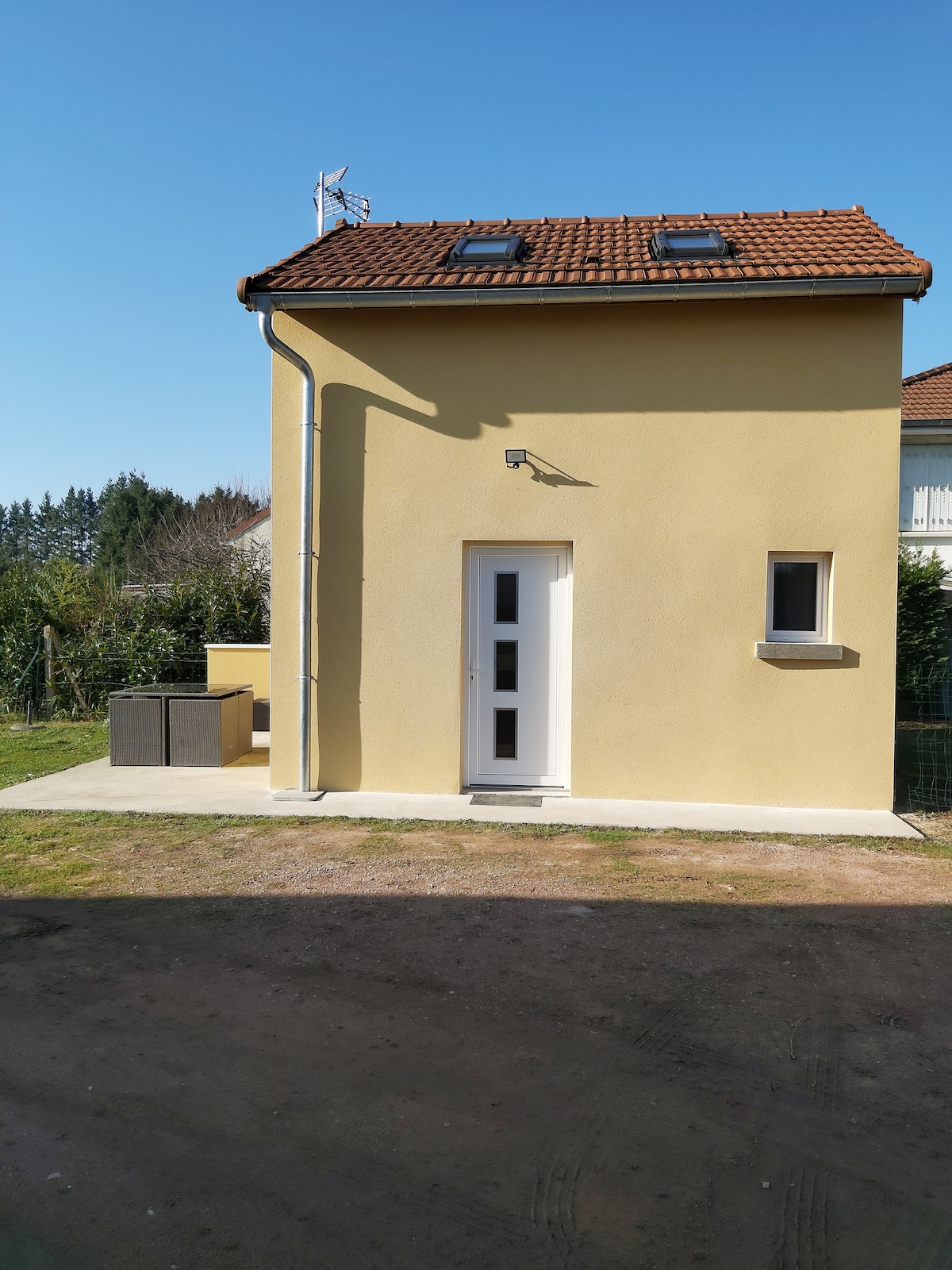 Maisonnette neuve indépendante de 40 m2 sur terrain privé clos, avec parking gratuit 3 voitures. Zone commerciale et centre ville sont à 10 mn à pieds A l'extérieur : terrasse avec salon de jardin et parasol, grand terrain avec pelouse RDC : Kitchenette avec ustensiles de base pour cuisiner, réfrigérateur avec partie congélateur, salle d'eau avec douche italienne, vasque WC Coin salon avec TV et BZ pour couchage double (140X190) A l'étage : lit double 140 X 190 et lit simple 90 X 190
