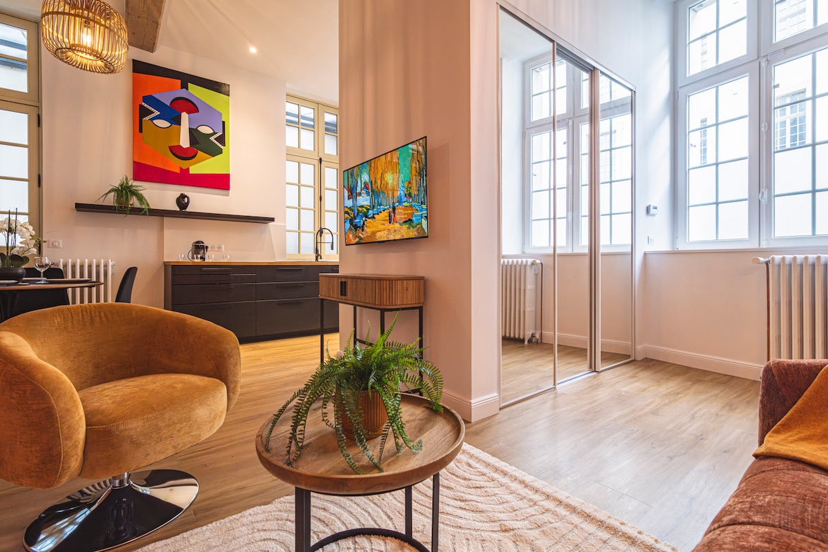 Set down your bags in this large, chic, high-end studio apartment with all the comforts, completely renovated by an architect, in the heart of Reims. Everything is within walking distance: the central train station, Place d'Erlon, Boulingrin, restaurants, and shops are just a few meters away. A rare location and an elegant, comfortable setting for a carefree stay. ⚠️ Bicycles are not allowed in the apartment.