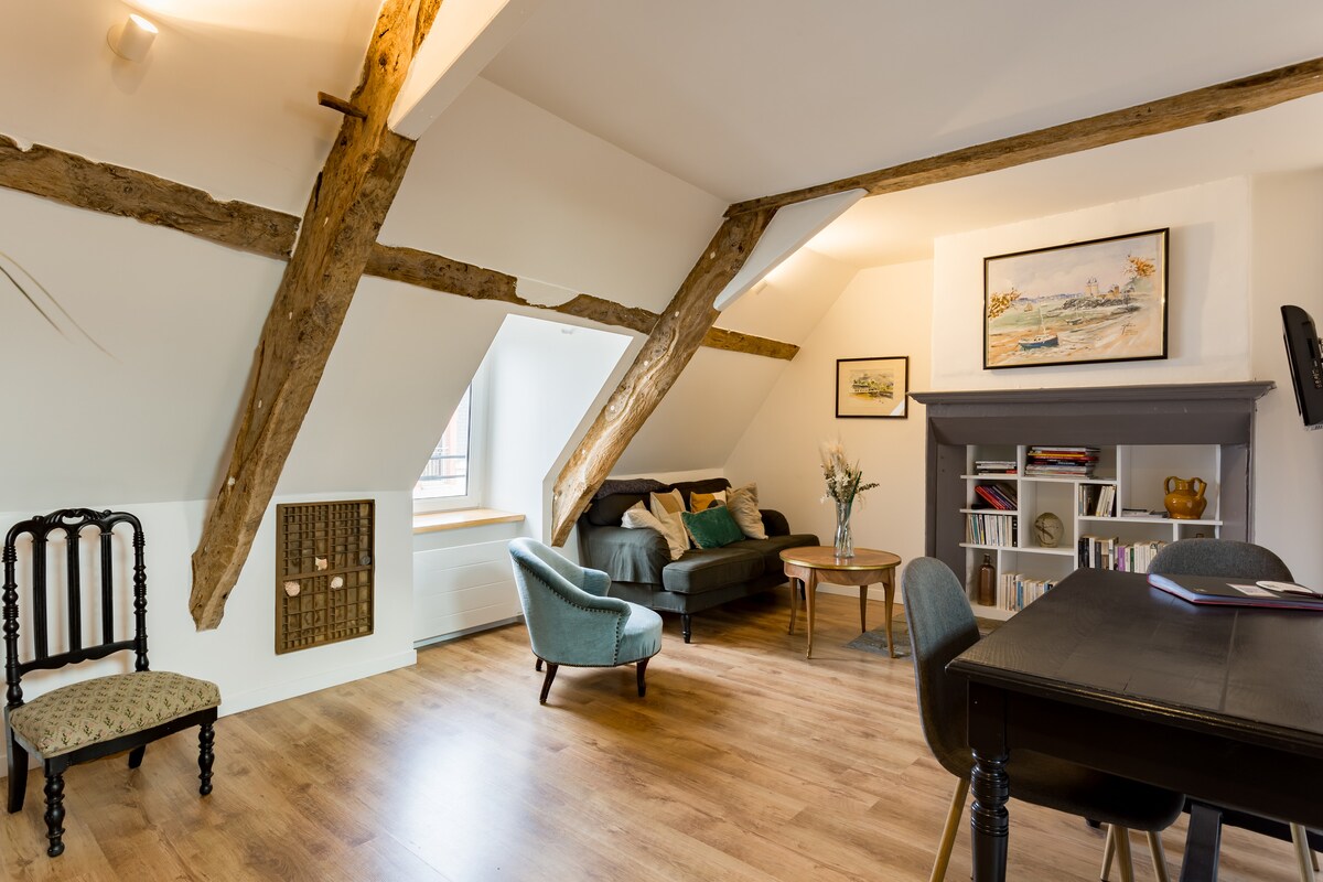 Large and bright apartment of 42 m², under the roof, in a quiet street in the centre of St-Servan. Ideally located, "close to everything", between the sea (200 m from the beaches), shops and restaurants (100 m from the centre) and 500 m from the town centre. Completely refurbished in early 2021. Mezannine with a bed of 160. Fully equipped kitchen. Independent bathroom (shower). It has all the facilities and comfort for an unforgettable stay in the Malouin country. Easy and free parking.