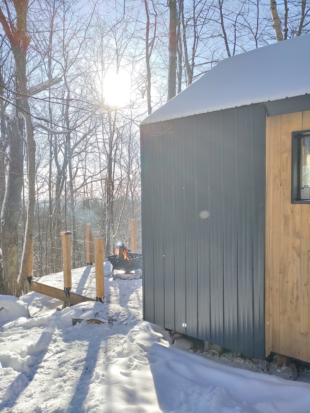 AVENTURE - HIKING Expérience de glamping unique en pleine nature! Situé à 20 min de marche en forêt du bâtiment d'accueil. Équipé de: 1 lit Queen BBQ, articles pour cuisiner 18 litres d’eau potable(pas d'eau courante) Poêle à bois et bûches(Pas de chauffage électrique) Éclairage solaire Toilette sèche à l’extérieur du chalet Accès à une salle de bain avec toilette et douche à l’intérieur du bâtiment principal . Profitez de la zone spa : 1 sauna et bains nordiques, le tout à 20 min de marche.