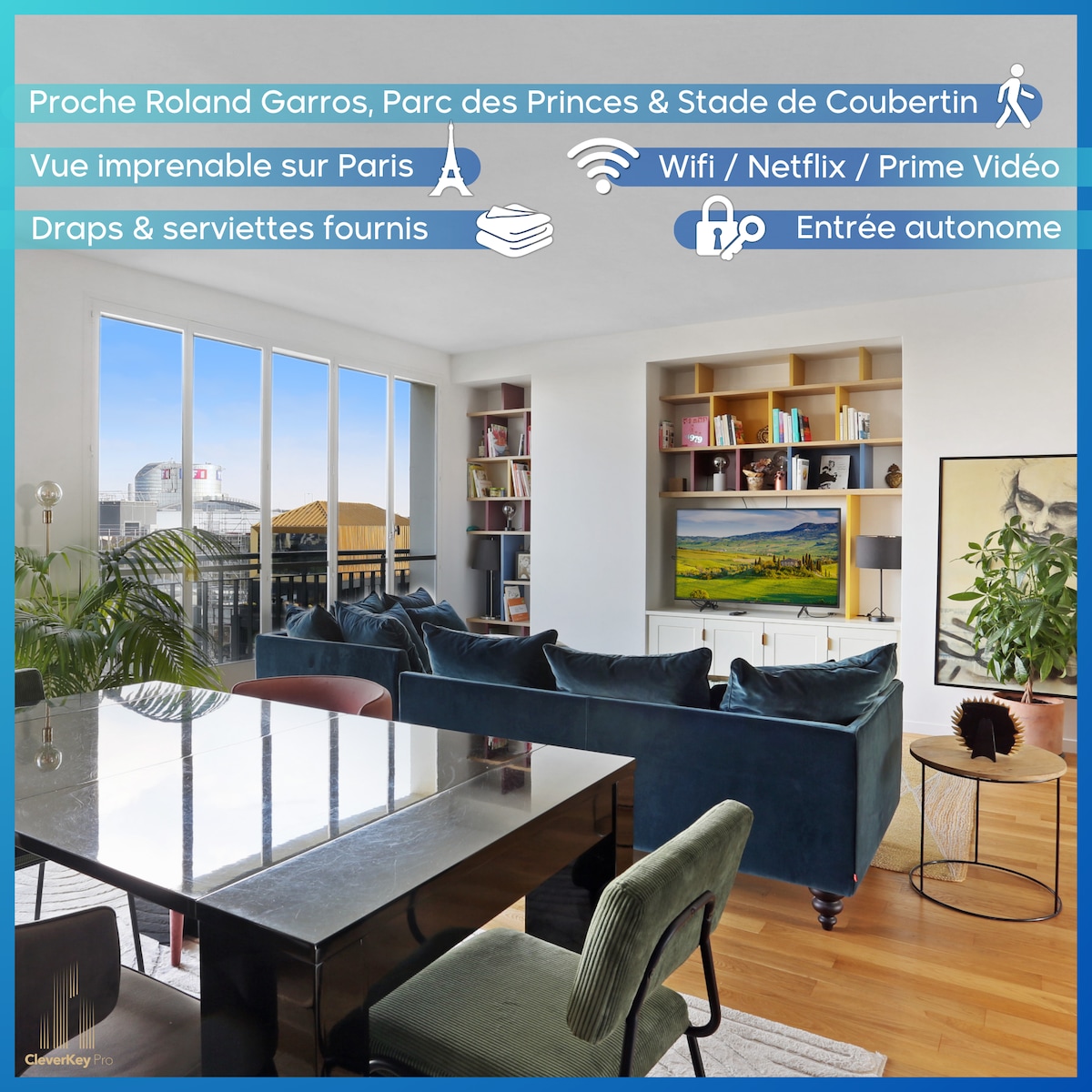 A 10 minutes Paris Pte st cloud, Parc des Princes, Roland Garros,Tour Eiffel, tram 2, RER vers Versailles ,2 pièces 36 M2,4 couchages, au 5e et dernier étage, ascenseur, refait à neuf, 1 chambre lit 160x200, séjour avec canapé convertible, salle d'eau avec grande douche, toilettes séparées, cuisine séparée entièrement équipée(four, micro ondes, réfrigérateur - congélateur, plaque 4 feux, hotte, lave-linge, lave-vaisselle, cafetière filtre et Nespresso, draps, serviettes. Smart TV 126 cm, WIFI.