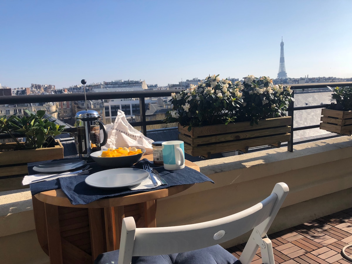 Fully renovated and refurbished studio with the most amazing view of the Eiffel Tower and most Parisian monuments. Wake up to the breathtaking sight of the Eiffel Tower right from your queen-size bed. The large French windows and the balcony make the experience even more memorable. The studio is located 10 min walk from the Eiffel Tower and 4 min walk from Metro stations. The building is safe, and there are plenty of shops and restaurants in the neighborhood. A/C, High Speed broadband, Netflix