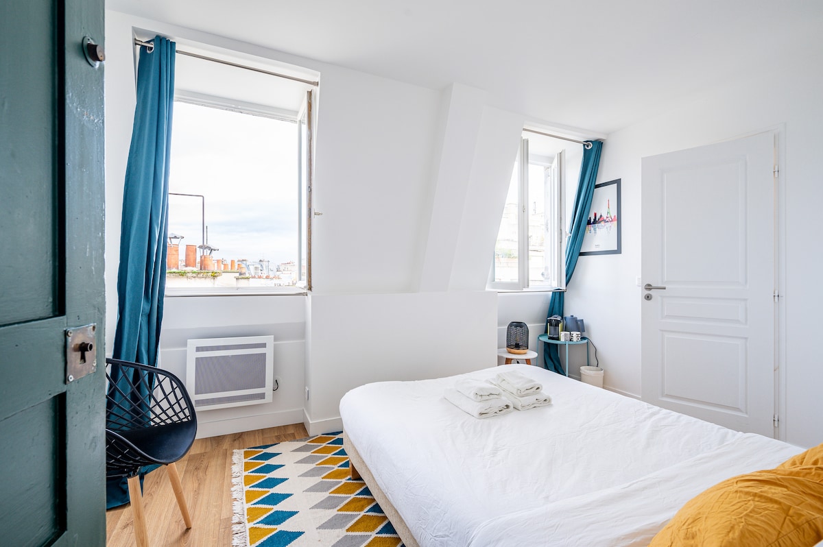 This isn’t for the faint hearted. To reach this cocoon of comfort, you’ll need to climb 6 floors using the back staircase, damaged by time, reminiscence of the time of Moulin Rouge… you’ll feel like Christian and Satine… Up there, under the roof of a beautiful Haussmann building, you’ll find a calm space, fully renovated/equipped, bathed in sunlight. You’ll be sleeping on the mezzanine, under the stars, the Eiffel Tower’s light as your lighthouse, reminding u that you’re in Paris, city of love…