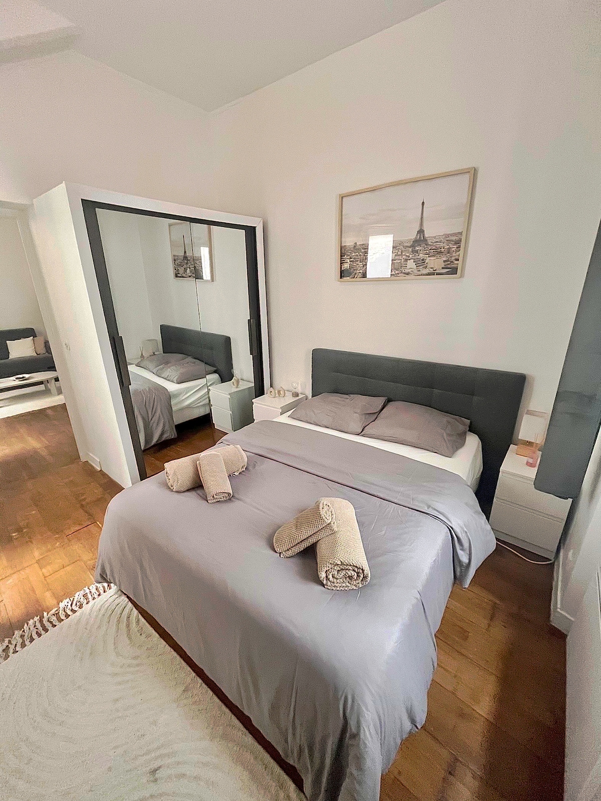 Appartement charmant, luxueux, cosy et lumineux de 31 m2 (1BD - 4P) idéalement situé à Paris 16 dans un quartier central, proche du Trocadéro, et calme (5min du métro Jasmin) avec tout commerce de proximité. Le logement offre des finitions modernes et chaleureuses et un espace optimisé : chambre et salon (canapé lit) séparés par une cloison élégante avec une télé intégrée amovible. Il est entièrement équipé (électroménager, linge, etc.) afin de profiter sereinement de votre séjour.