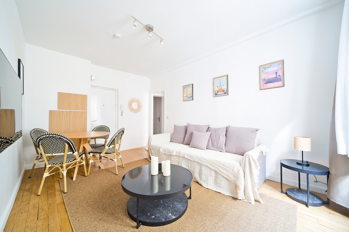 Overlooking our stunning inner courtyard and the charming neighboring church, your pied-à-terre offers open views, incredible natural light, and absolute tranquility—right in the heart of Paris. Each apartment includes a living room with a sofa bed, a dining area with a round table, a beautiful bedroom featuring a luxury hotel–quality bed, a fully equipped open kitchen with a dishwasher and washer-dryer, a shower room, and a separate toilet.