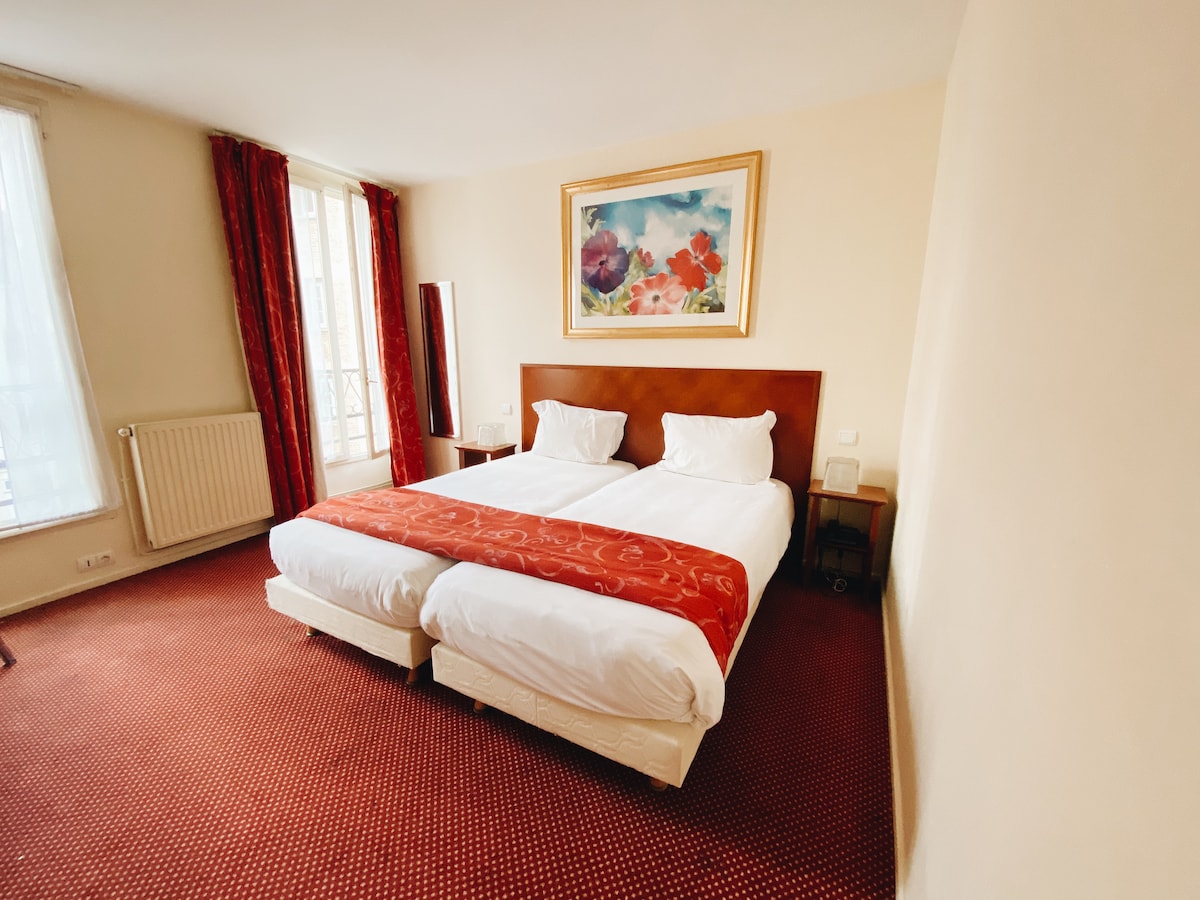 The Parisette Classic - Double room offers Parisian chic in a snug, contemporary-style retreat, featuring 10 to 13m² of comfort with twin beds (2x90cm) or a queen-size bed (160cm), an Italian-style shower, and thoughtful amenities like a separate hairdryer, Omnisens well-being toiletries, broadband Wi-Fi, a personal safe for a 15” computer, individual air conditioning, and an 82cm flat-screen TV with international channels.