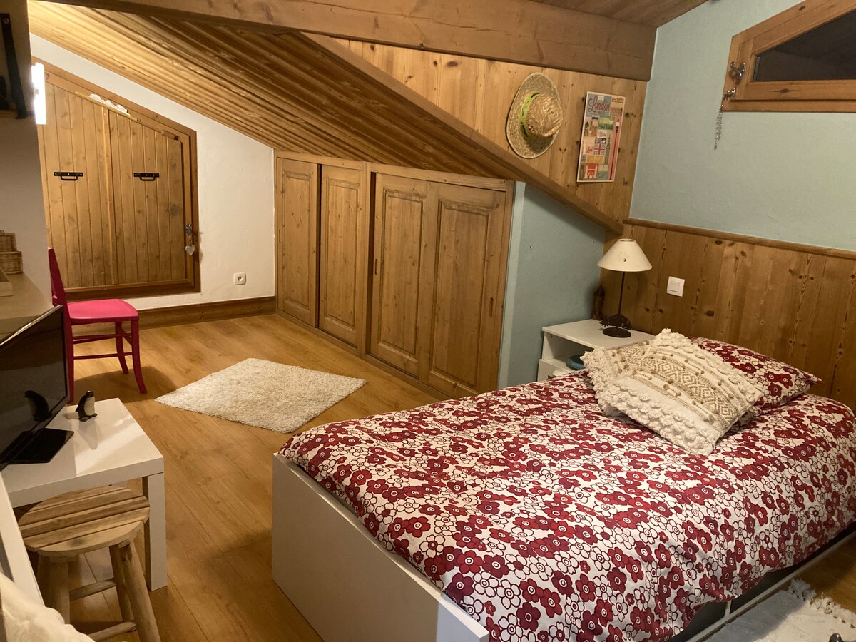 Magnificent view of the Oisans mountains, chalet-style room, nearby ski resorts, 7 minutes by car, summer/winter walks, on foot, by bike, hiking. Linked to Alpe d'Huez. Bedroom and private bathroom, fridge, TV, large terrace, land of 1000m2. Games for children. 1 bedroom for lovers. Table d'Hôtes possible for dinner (27,50€/person). For a booking for 1 week the last night is free Book 7 nights and pay only 6