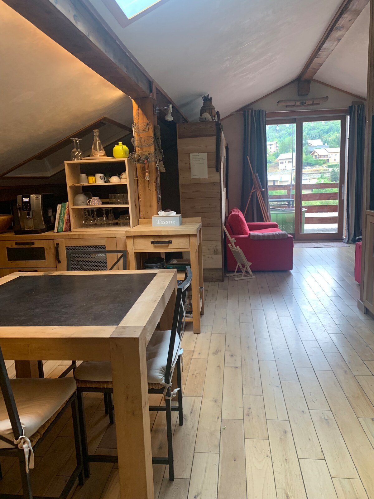 DRAPS NON INCLUS Charmant appartement style Loft, récemment rénové au plein coeur de Bourg d'Oisans, village sportif et capital du velo. Situé au deuxième étage d'une maison de village, vue sur les crêtes de l'Alpe d'Huez ainsi que la falaise de Pregentil qui surplombe le village. -Il y a une grande chambre avec un lit king size -Une mezzanine avec 2 lits simple -Une grande cave pour mettre les vélos, skis... -Parking à 50m du logement -Proche des Bars, restaurants, commerces...