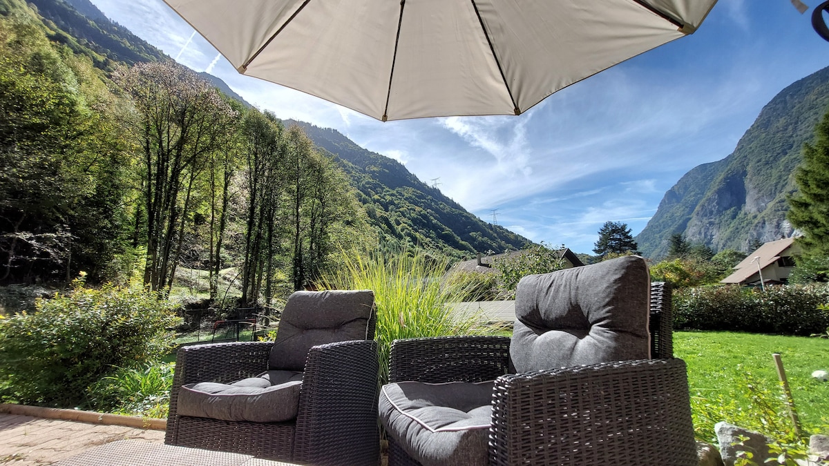 Newly finished modern ground floor suite in local family house with sunny patio/garden/bbq access on the uphill edge of the tiny quiet hameau of Ventelon. One bedroom with queen size bed and single bunk with additional single bed/sofa in living area (baby bed/high chair also available) with views to the high summits. Fully equipped kitchen with induction cooking/oven. Perfect base for direct ski touring/hiking/paragliding access to the fabulous terrain on the sunny side of the valley.