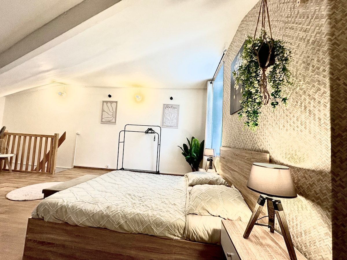 Beautiful industrial loft totaly restaured. Located in our house, the loft is completely private, you share the entrance hall and the backyard with us. The loft features 1 kitchen 1 huge bedroom with a 1m80 width bed and a mezzanine with the sitting-room view. There is a also a cosy reading corner and a beautiful brand new bathroom with an italian shower. 65 square meters in total with air conditioning. Access to the jacuzzi is optional for 20€ bathrobes included.