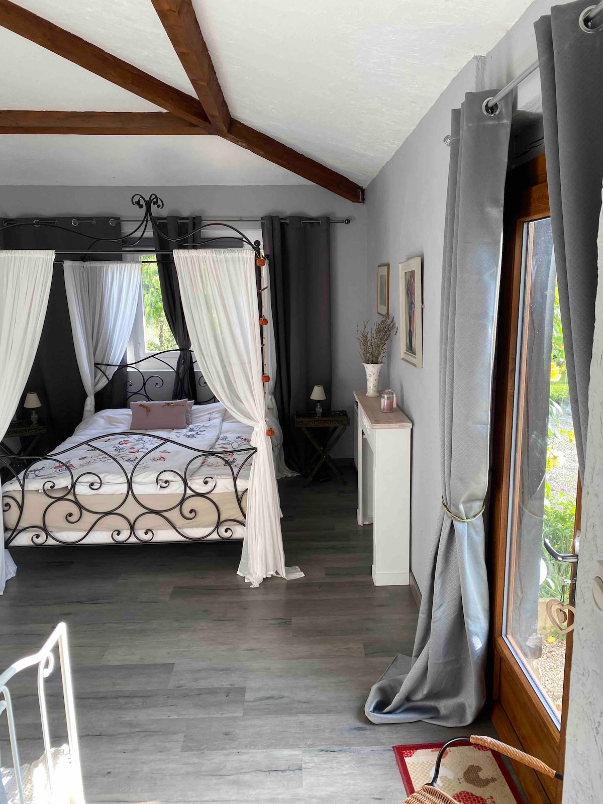 Pour un séjour de charme au calme du Morvan, seul ou en couple, je loue une suite (26m²) avec une entrée et une terrasse privatives, WC privatifs, dressing, baignoire ouverte sur la chambre et lit de 160 x 200. Petits déjeuners, draps, linge de bain et frais de ménages inclus au tarif de base. Une kitchenette est disponible dans les parties communes (à l'extérieur de la chambre) avec plaques à induction, four à micro-ondes et réfrigérateur.