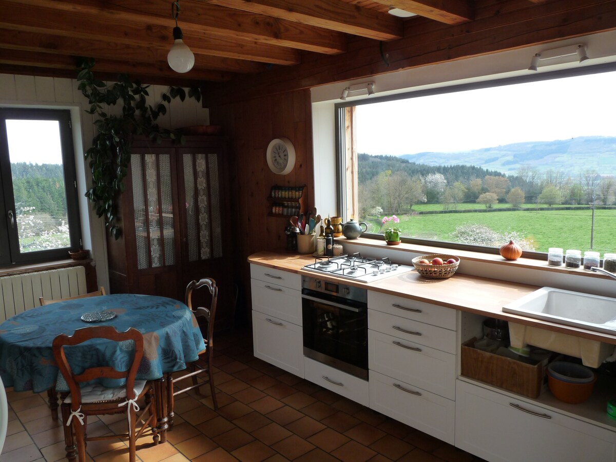 Le chalet est situé au plus haut plateau derrière la grange, accès privé et jardin avec une très belle vue. Il y a un lit double, salle de bain, armoire, cuisine, réfrigérateur et tout le nécessaire (vaisselle, ustensiles de cuisine), ventilateur. Chalet Bellevue is voor u ingericht met eigen douche, toilet, wastafel en kookgelegenheid en -benodigdheden. Een eigen terras met veel privacy en prachtig uitzicht op de groene heuvels van de Morvan. Wij staan graag voor u klaar...