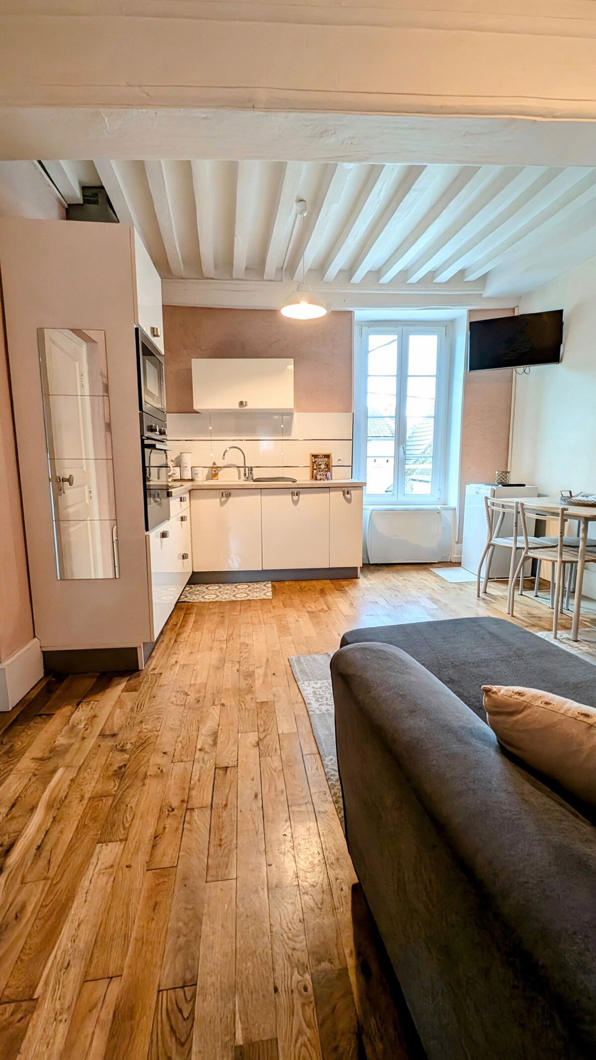 Welcome to our charming apartment, which we’re proud to say has a four-star award from the Departmental Tourist Board. It's in an historic buidling, inside the ramparts in the very heart of Beaune, but in a quiet side-street. It features a salon/dining room, an independent, fully-equipped kitchen, a bedroom and separate bathroom. Bright and sunny with high-beamed ceilings, a stone staircase and marble corridor, it also features a lovely glass 'verrière' overlooking an interior courtyard.