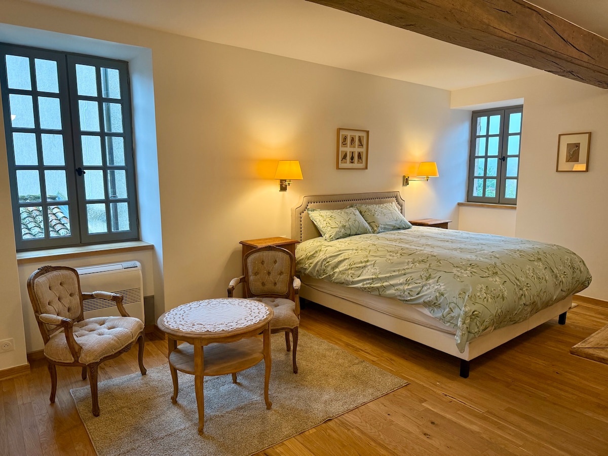 Une belle Suite 60 m² rénovée avec charme et modernité, notre Suite vous accueillent dans un cadre chaleureux, spacieux et confortable. Elle disposent au choix d’un lit double ou « Queen Size », canapé lit et d’une belle salle de bain avec balnéo privative avec baignoire. La Suite offre également un beau salon et un bureau, et sont équipées de la Wifi et d’un téléviseur. Selon la période, relaxez-vous au jardin ou autour de la piscine chauffée.