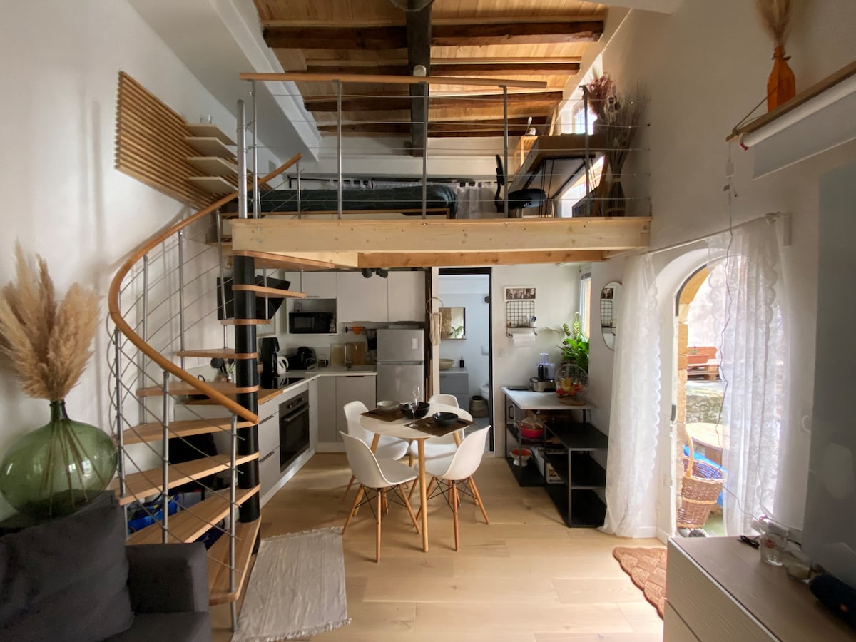 Authentique canut de 250 ans, cœur Croix-Rousse, cosy & calme. Plongez dans l'histoire d'un immeuble lyonnais du XVIIIe siècle. Ce canut aux pierres apparentes et plafond lyonnais offre une ambiance chaleureuse, baignée de lumière plein sud. La pièce de vie réunit un salon, une cuisine équipée et un coin bureau dédié avec wifi fibre rapide – idéal pour télétravail ou séminaires. À 1 mn du métro, vous êtes entouré de marchés, bouchons et boutiques, tout en profitant d'un calme absolu la nuit.
