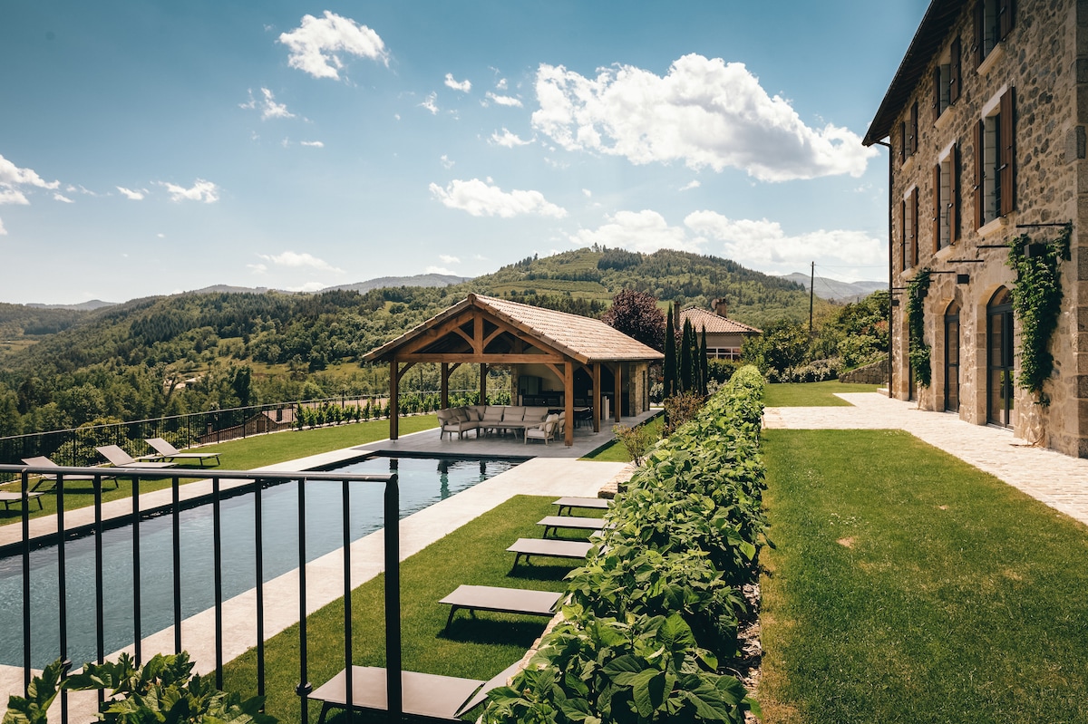 Offrez-vous une escapade romantique dans une ferme du 18ᵉ siècle rénovée. Studio chaleureux avec vue panoramique sur les montagnes, jacuzzi & sauna privatifs, sans vis-à-vis. 🌹 Champagne, fleurs & pétales disponibles pour sublimer vos soirées. Espace extérieur cosy avec barbecue, à 5 min des restaurants & rivière. 📍35 min St-Étienne, 10 min Yssingeaux, 30 min Le Puy, 10 min passerelles himalayennes.