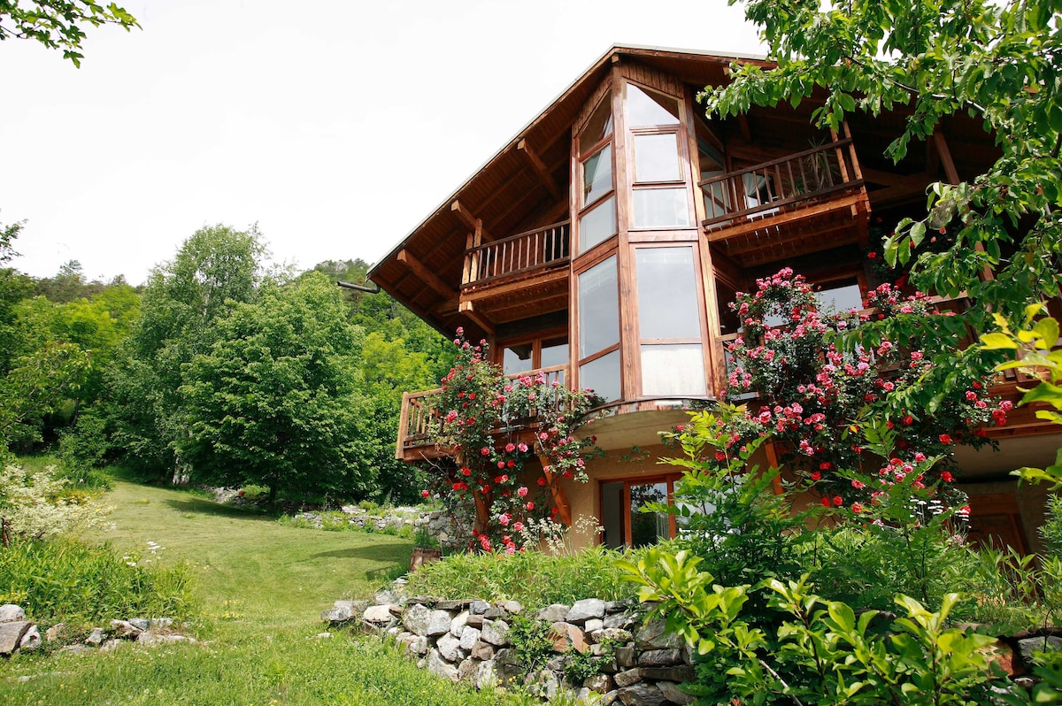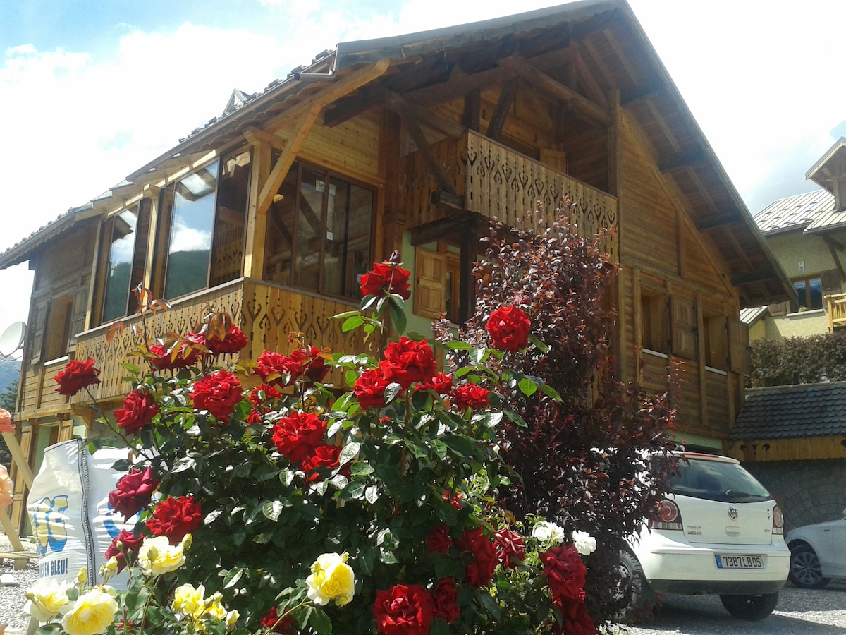 Tout proche et dominant le village de Vallouise, le chalet de Marie lumineux et très confortable conçu par un architecte, est entouré d'un beau jardin de montagne, vous y serez au calme, dedans comme dehors vous y apprécierez la vue d'une montagne apaisante, l'exposition vous permettra de profiter du soleil toute la journée. Bien qu'à 5 mn à pied du centre du village et de ses commodités le lieu est très calme. La grande pièce à vivre est agrémentée d'un poêle pour vos soirées d'hiver.