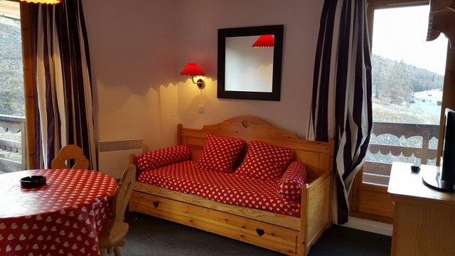 Résidence Antarès,T2 meublé dans résidence sécurisée par digicode. Calme et très cosy aux pieds des pistes,piscine chauffée Entièrement équipé et tout confort,2 TV,grand frigo/congélateur,literie chambre en 160,lit mezzanine en 150 dans coin nuit ouvert + lit en 90 en dessous Cafetière électrique,tassimo,appareil à raclette,fondue,plancha,grille pain,four, micro-onde,lave-vaisselle,lave linge,aspirateur,plaque vitro céramique,balcon équipé table et transat Position N/E très ensoleillé classé 5 *