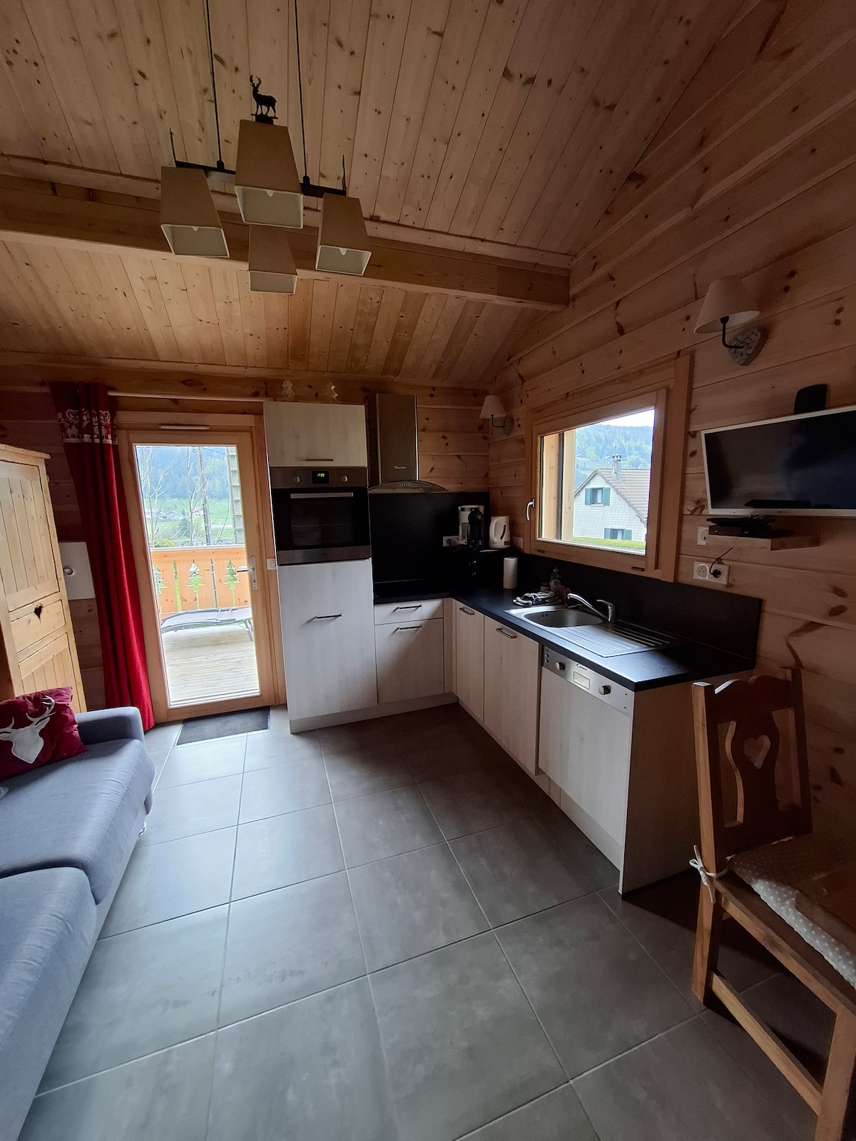Studio cosy dans chalet 19m2 Entrée et terrasse indépendante Meublé tout confort avec cuisine équipée(four,lave-vaisselle, micro-onde, cafetière, bouilloire), salle de bain(avec douche,lavabo et wc), un canapé Bz avec matelas confortable, Meuble de rangement, télé, wifi, terrasse. Situé dans une impasse, coin tranquille, à 300m du centre du village. Proche de la boulangerie, pharmacie, office du tourisme, magasin bi1,des pistes de ski de fond, du ski bus.