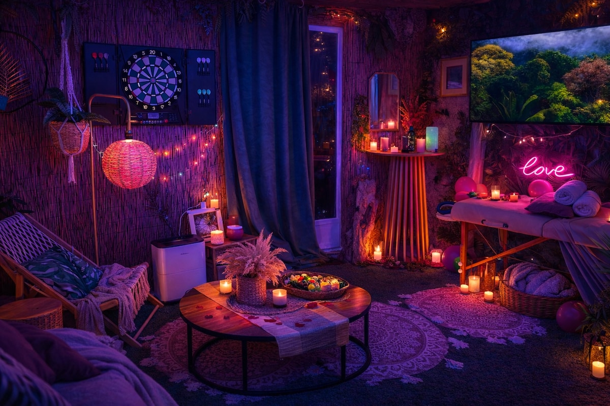 ✨ Découvrez le Mirage Tropical , une parenthèse raffinée au bord de la Loire 🌴. Profitez d’un Spa , Table de Massage d’une terrasse élégante et d’un espace jungle dépaysant pour vous évader. Amusez-vous autour du jeu de fléchettes, partagez un apéro exotique ou détendez-vous dans une atmosphère unique. Le soir venu, la chambre s’illumine de couleurs envoûtantes pour un moment chic et romantique 💖. Ici, chaque détail sublime votre séjour pour créer des souvenirs mémorables.🌴❤️❤️💕💕💕👄🫂❤️